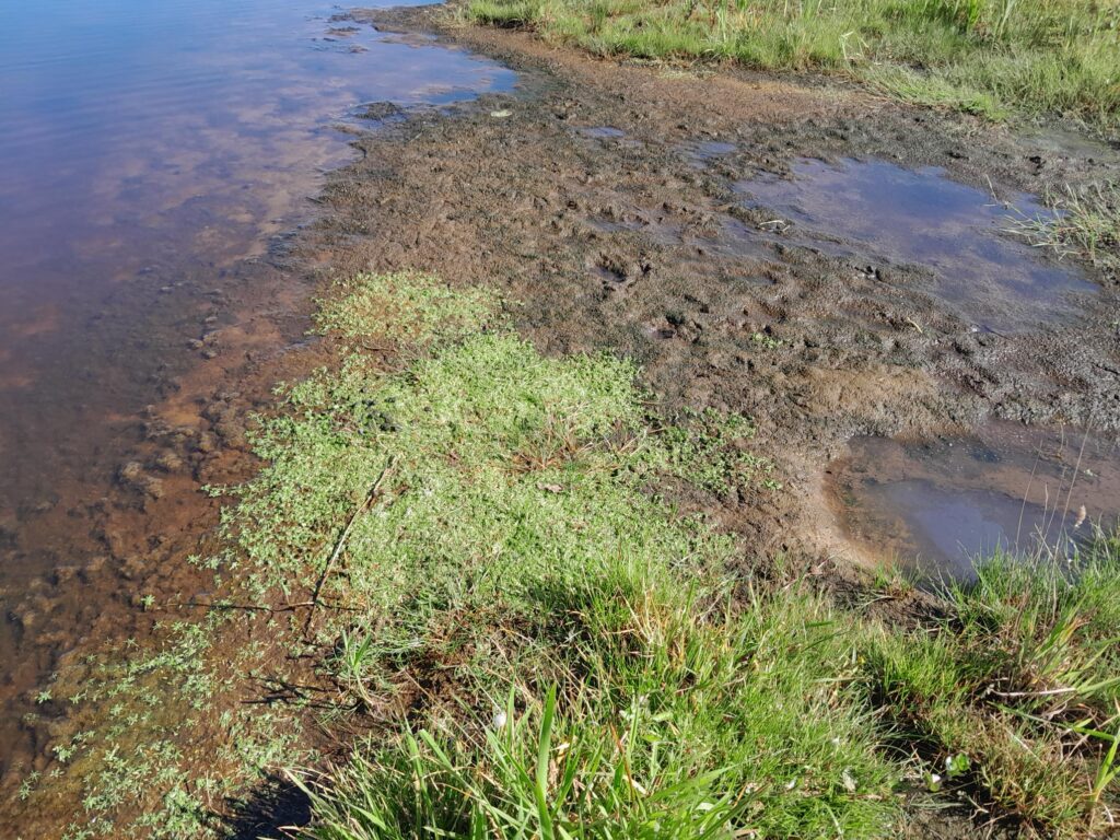 Vorig jaar was er veel alg in het water van de speelnatuur. Er zijn toen uiteindelijk twee ruime geulen gegraven naar de grote waterplas voor meer doorstroming. Er is nu geen alg. Hopelijk blijft het mede door die geulen nu algvrij.