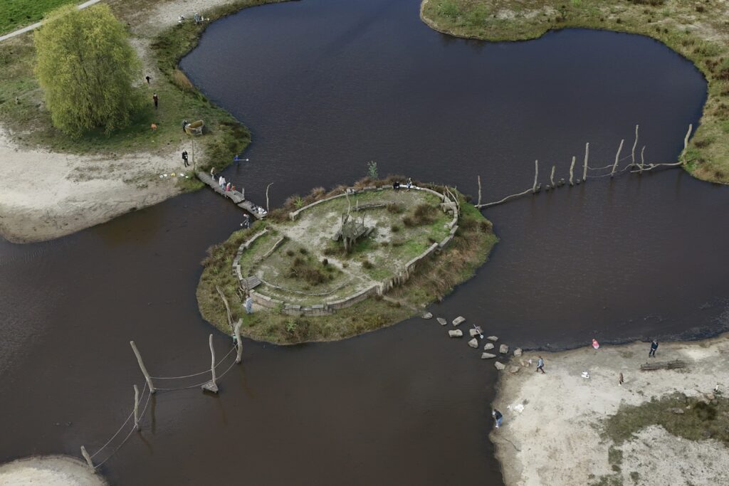 Daarboven het wandelgebied. Daar weer boven het rusteiland. Rechtsboven de plas met het Kijkei.